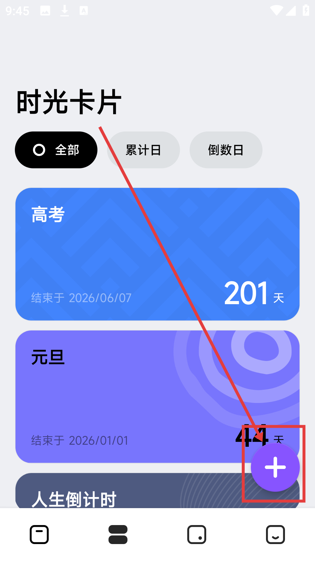 3、在时光卡片页面,点击右下角紫色加号按钮,可进入添加卡片页面,准备创建新的时光卡片啦。