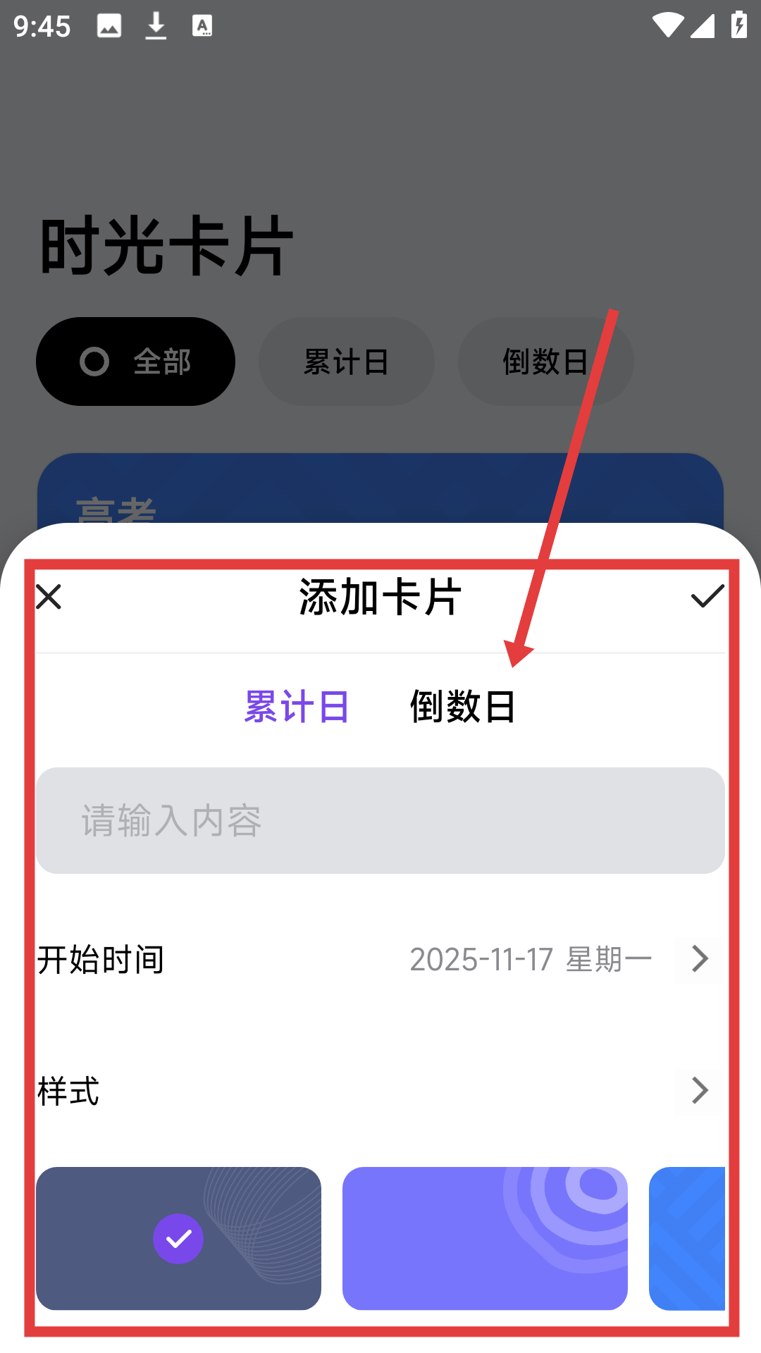 4、进入添加卡片页面后,可选择累计日或倒数日,设置开始时间、样式等,完成时光卡片的创建哦。
