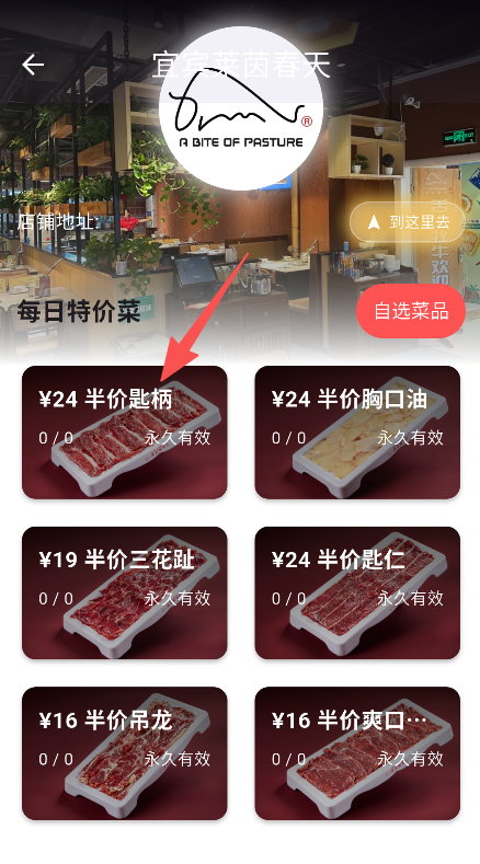3、可自选菜品,在目标门店中选择心仪菜品,完成就餐前的菜品挑选。