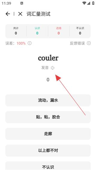 4、在词汇量测试页面,可查看单词【couler】,然后选择正确含义。