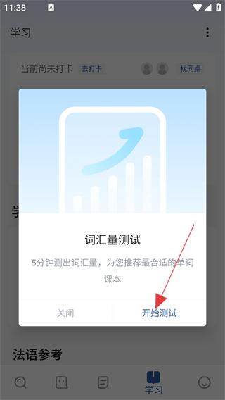 3、在弹出的词汇量测试弹窗中,点击【开始测试】,开启词汇量检测。