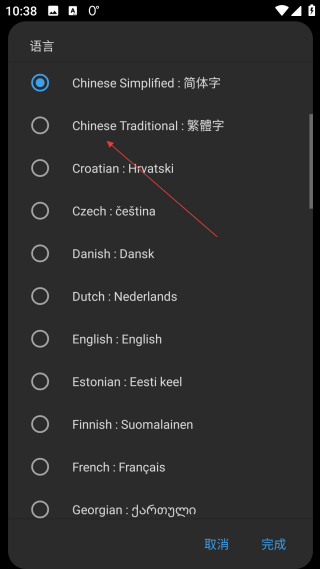 4、在语言选择界面,选择【繁體字】,即可将应用语言设置为繁体中文。