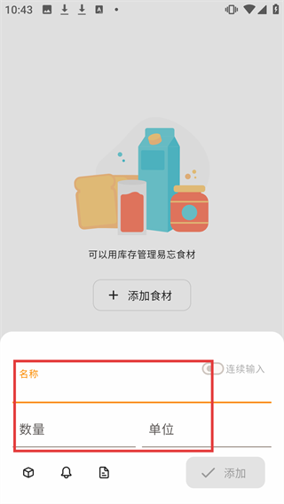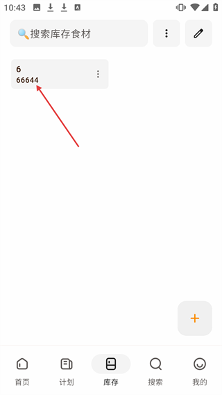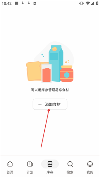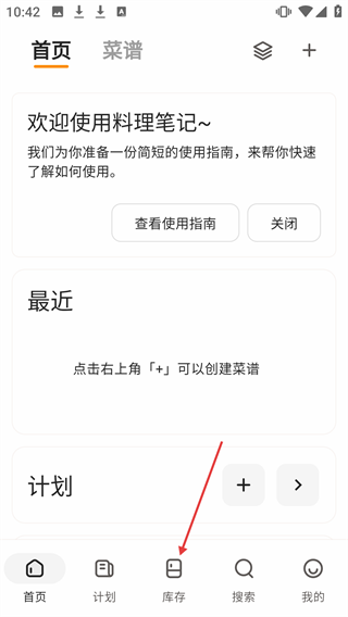 1、在料理笔记首页,点击底部【库存】进入库存页面。