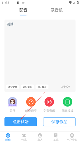2、进入配音页面,可在文本框输入内容,选择配音角色后点击【点击试听】。