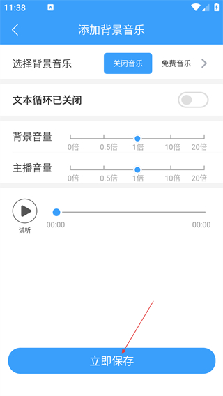 4、在添加背景音乐页面,设置好背景音乐及音量等参数后,点击【立即保存】完成作品保存。