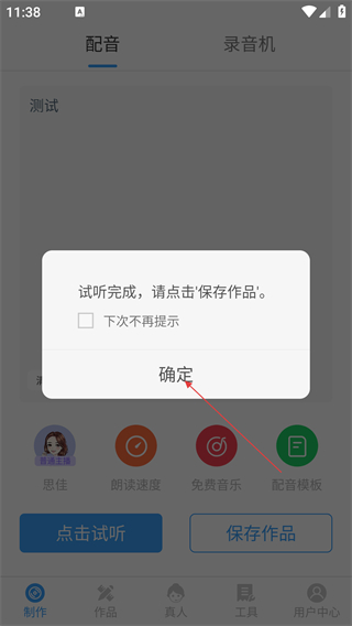 3、试听完成后,在弹出的提示框中点击【确定】,可进行保存作品操作。