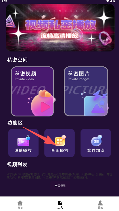 2、在功能区选择“音乐播放”按钮进入本地音频列表。