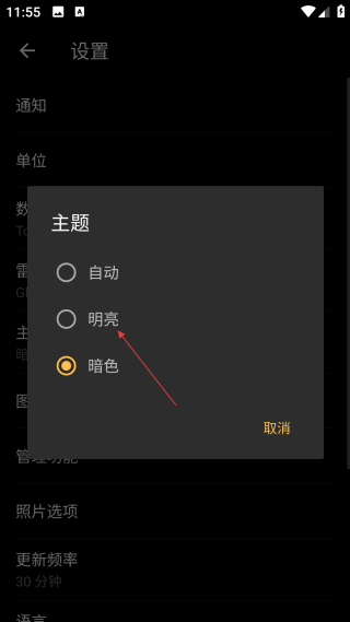 4、在主题选择界面,选择【明亮】,即可将应用主题设置为明亮模式。