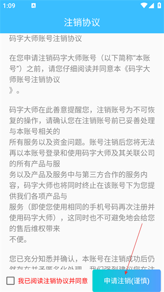 4、在注销协议页面,阅读并同意协议后点击【申请注销(谨慎)】完成账号注销。