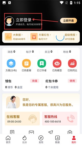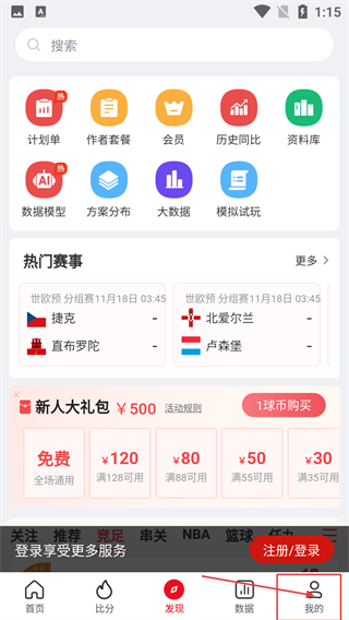 1、在体育数据类APP的发现页面,点击右下角“我的”,进入个人中心页面。