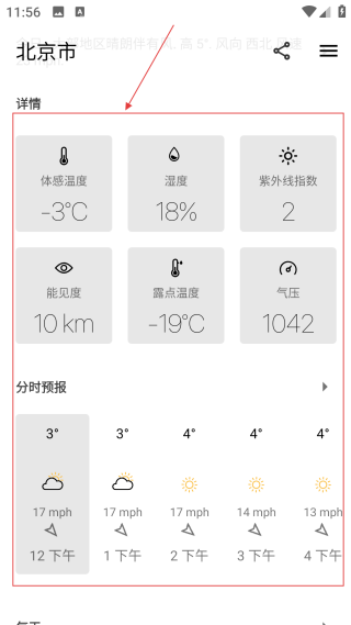 2、在天气详情界面,可【查看体感温度、湿度、紫外线指数】等信息,掌握天气变化细节。