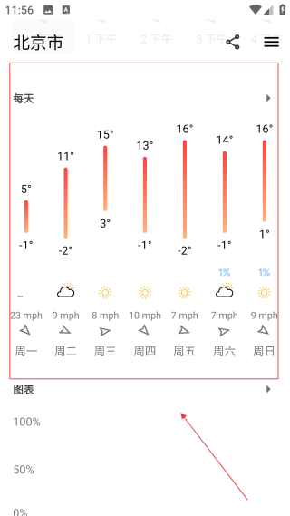 3、进入每日天气界面,可【查看未来几天温度、天气状况、风速】等,做好出行规划。