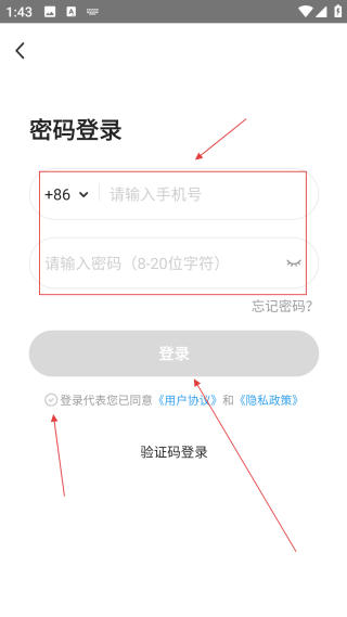 4、在密码登录界面,输入【手机号和密码,勾选同意协议】后点击【登录】,即可完成密码登录操作。