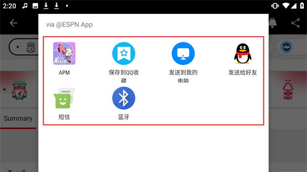 4、在分享界面,可选择APM、QQ收藏、电脑、好友、短信、蓝牙等多种方式分享赛事信息。