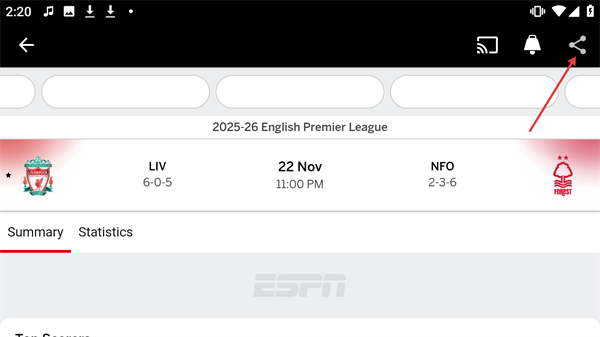3、在赛事详情页(如2025-26英超LiverpoolvsNFO),点击右上角分享图标,可进入分享界面。
