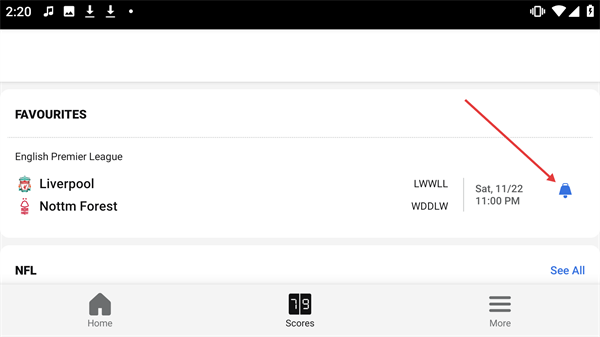 2、在关注的联赛(如英超)和球队(如Liverpool)旁,点击铃铛图标可设置比赛提醒,及时获取比赛时间通知。