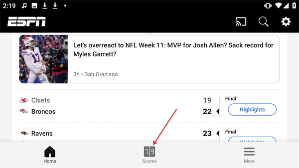 1、点击底部【Scores】,可查看NFL等赛事最终比分。
