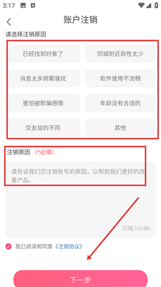 4、选择注销原因并填写说明后,点击【下一步】,完成账号注销操作。