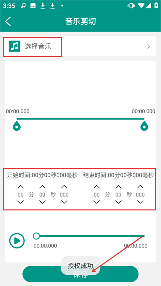 3、进入音乐剪切页面,点击【选择音乐】,设置开始时间和结束时间后点击【保存】。