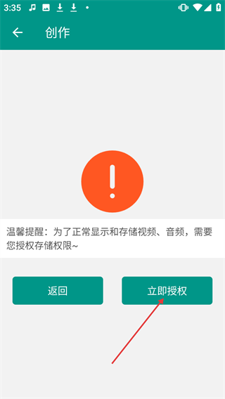 2、在创作页面点击【立即授权】,授予存储权限。