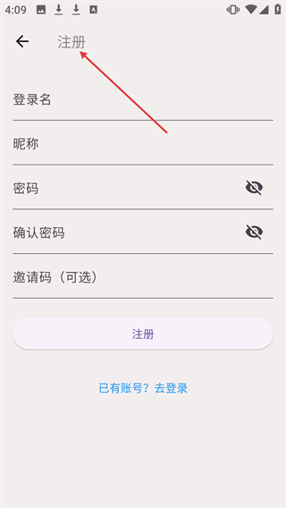 4、在注册页面填写登录名、昵称、密码、确认密码(邀请码可选),然后点击 “注册” 完成账号注册。
