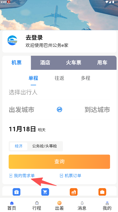 《巴州公务e家》是一款面向公务差旅的在线预订软件,软件界面清晰区分单程、往返、多程等行程类型,并提供经济舱、公务舱/头等舱等舱位选择。亮点在于设有我的需求单与机票订单模块,便于统一管理差旅需求与历史记录。通过简洁的选项卡布局与明确的分类指引,为公务人员提供高效、规范的一站式差旅预订解决方案。