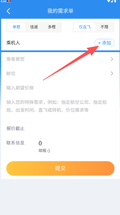 2、在需求单页点击乘机人右侧的“+添加”进入人员选择界面。