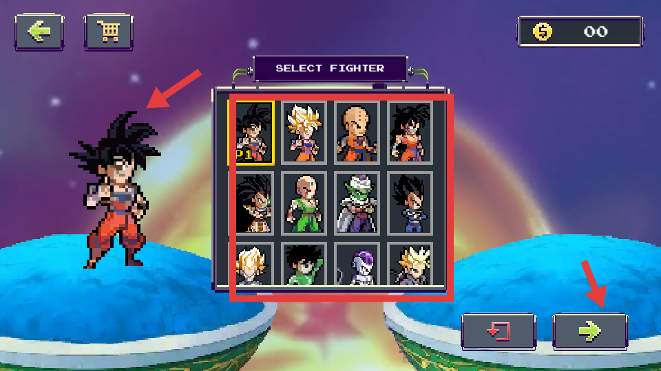 2、在“SELECTFIGHTER”界面,从多个龙珠系列角色中挑选心仪角色,点击右侧箭头按钮进入战斗。