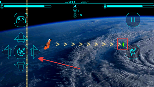 2、关卡中操控【火柴人】移动,利用左侧推进装置调整方向,朝着右侧【绿色目标】前进完成阶段任务。