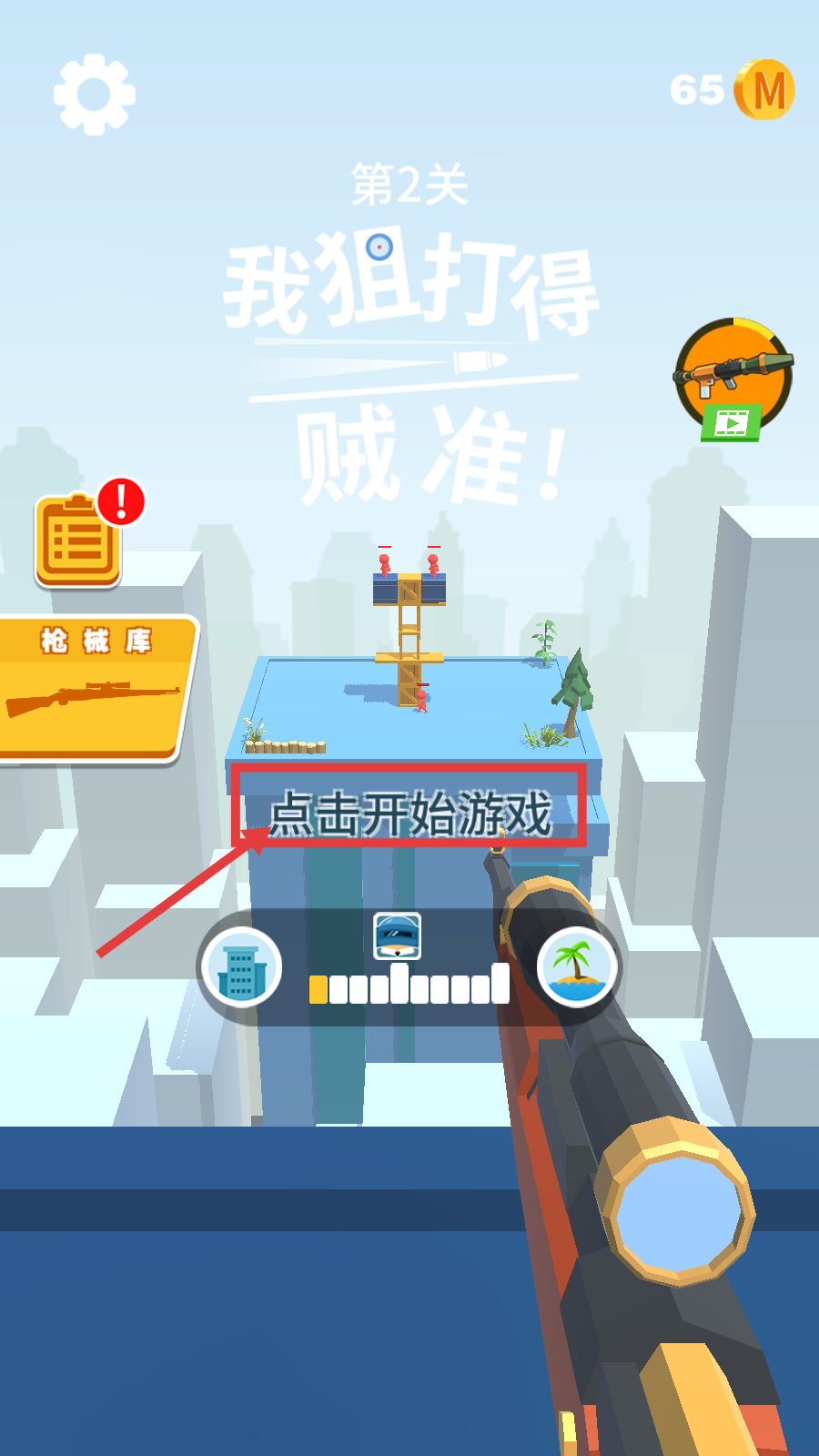 1、第2关时,点击【点击开始游戏】进入狙击关卡,可在【枪械库】查看武器,为狙击敌人做准备。
