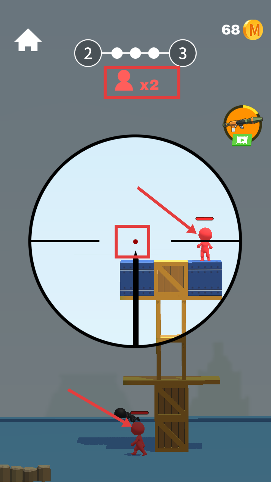 2、瞄准阶段,留意【人物-x2】的敌人分布,分别在高处和低处,调整瞄准镜精准锁定目标。