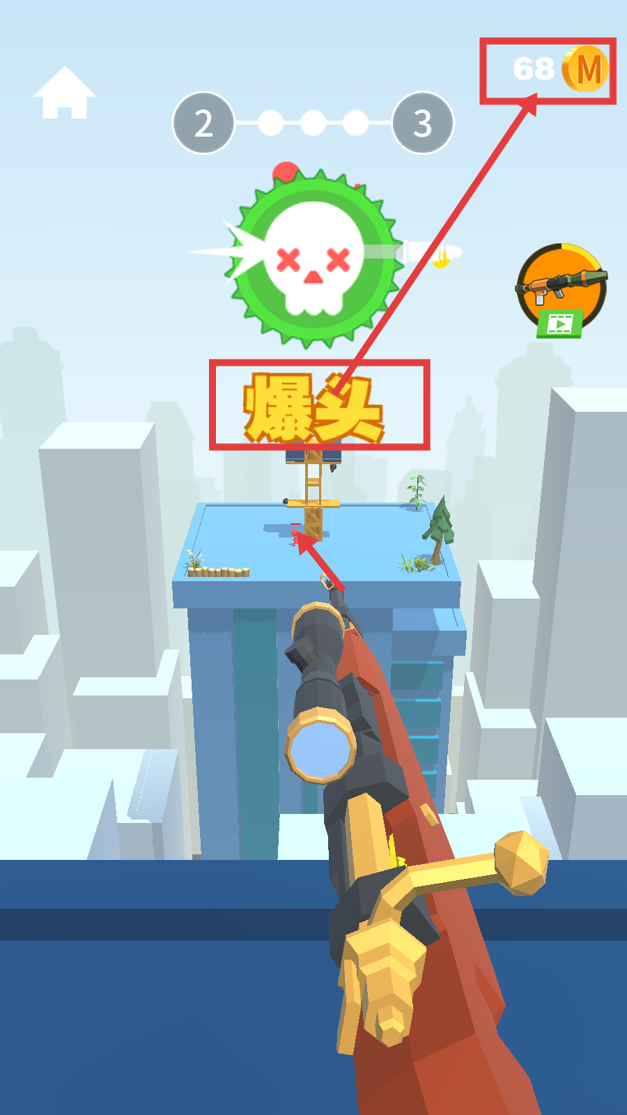 3、射击时尽量达成【爆头】,能获取更多【68-M】金币,高效积累资源提升得分。
