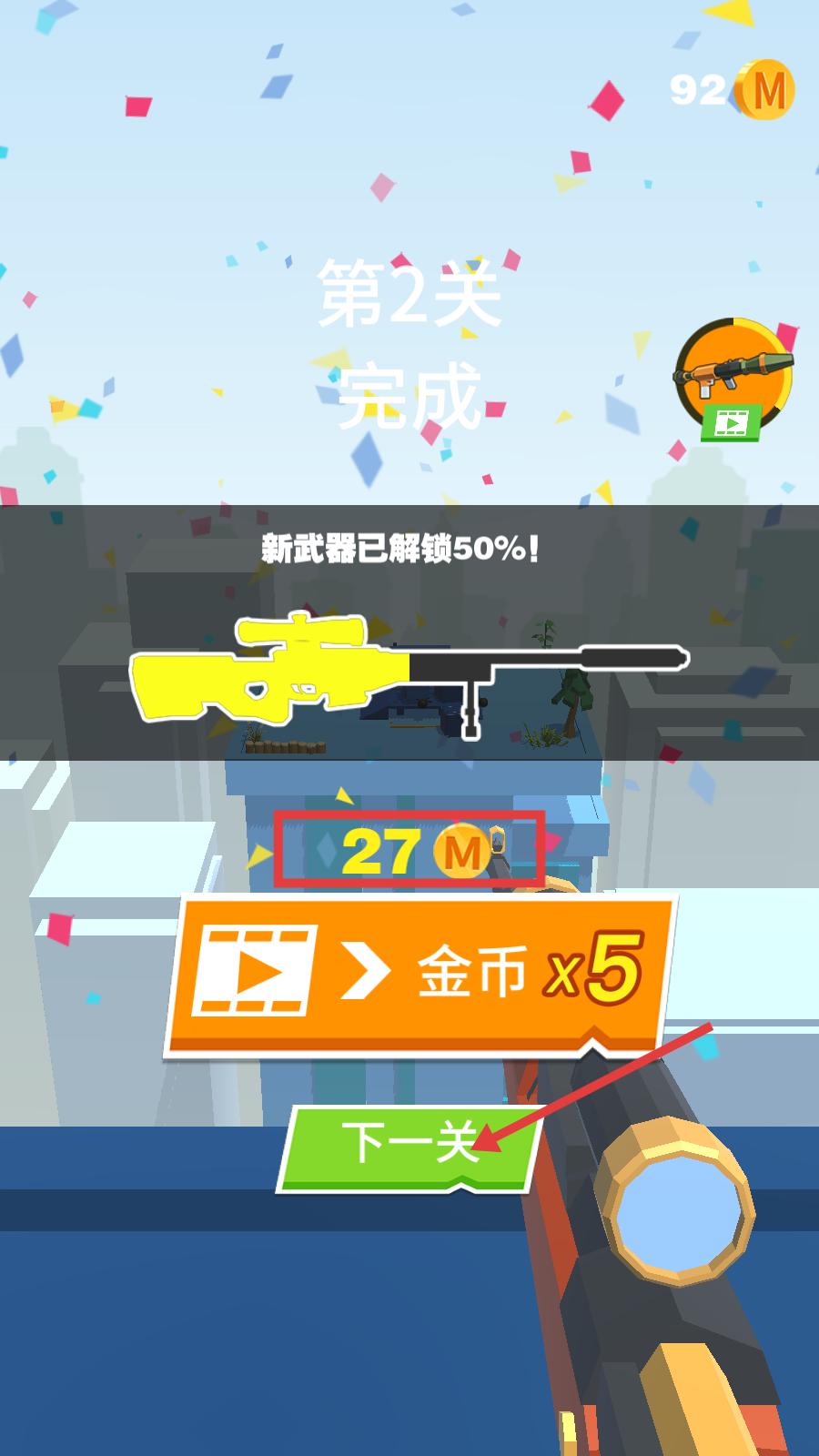 4、完成第2关后,获得【27-M】金币,新武器解锁50%,点击【下一关】继续挑战以解锁更多武器。