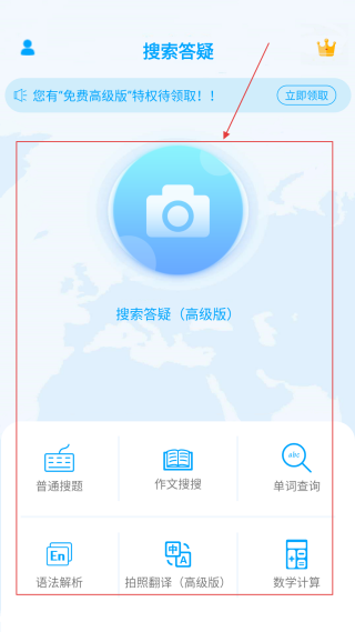 1、进入搜索答疑界面,可使用【搜索答疑】功能,还有作文搜搜等工具,满足不同学习需求。