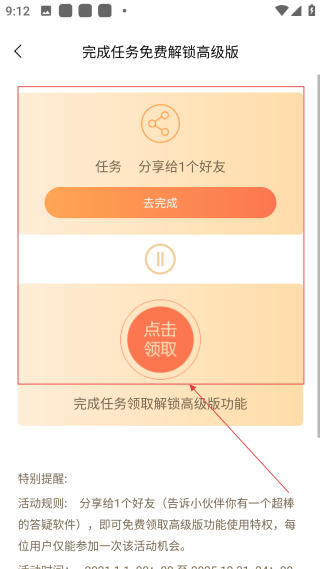 3、进入解锁界面,可完成【分享好友的任务】,领取解锁高级版功能,获取更多学习工具权限。