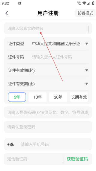 4、在注册页面,依次填写姓名、证件信息、登录密码、手机号等内容,获取并填写验证码后完成注册。
