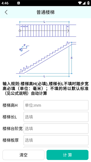 4、在普通楼梯界面,填写楼梯高H等参数后,点击【计算】即可获取对应计算结果。