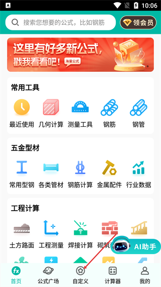 1、点击底部【自定义】,进入自定义公式页面。