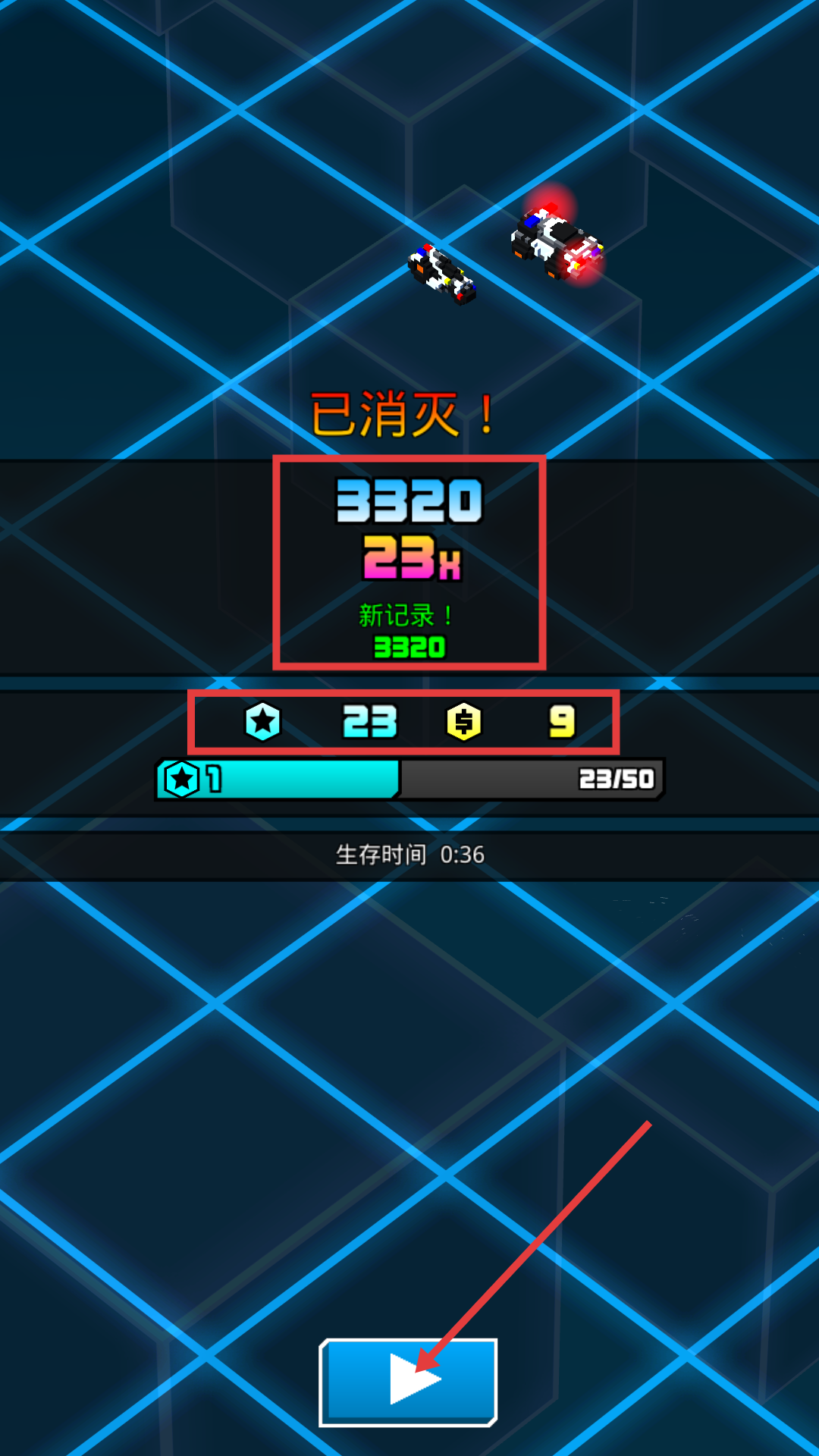 4、结算时获得【3320-23x-新记录】,积累【23-星】和【9-金币】,点击蓝色按钮继续挑战,积累资源升级载具。
