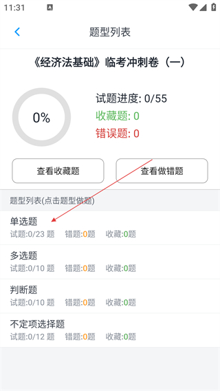 3、在题型列表页面,点击对应题型(如单选题),进入具体试题的作答界面。