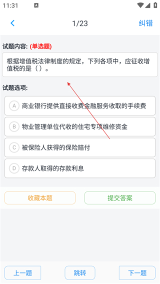 4、在试题界面,完成选项选择后,点击【提交答案】即可完成该题作答,也可使用“上一题”“下一题”切换题目。