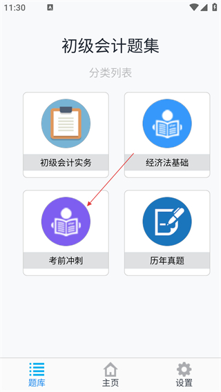 1、在初级会计题集的分类列表中,点击【考前冲刺】选项,进入考前冲刺页面。