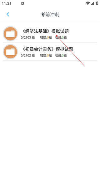 2、在考前冲刺页面,选择目标模拟试题,进入题型列表页面。