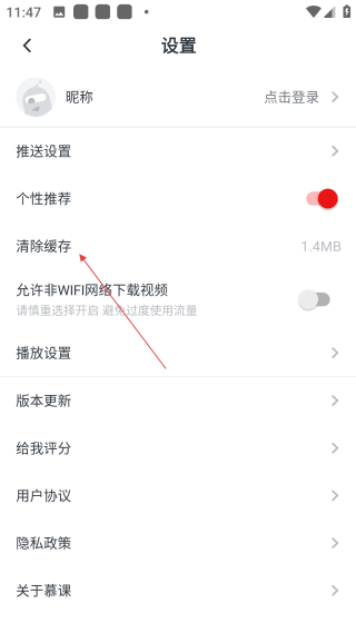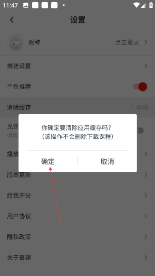 3、在设置界面,点击【清除缓存】,触发清除缓存的确认提示。