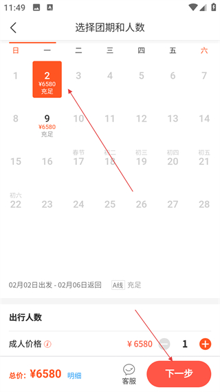 4、选择目标出发日期,确认出行人数后,点击【下一步】继续完成预订流程。
