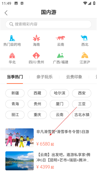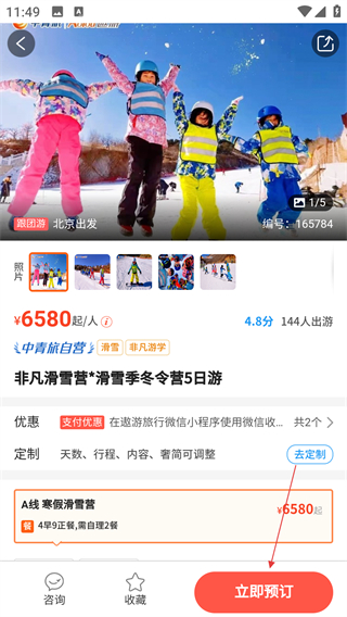 2、在国内游页面,选择目标旅游项目(如“非凡滑雪营·滑雪冬令营5日游”),进入详情页。