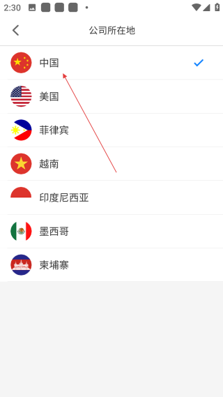 1、在公司所在地页面,选择【中国】,确定公司所在地区域。