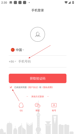 2、进入手机登录页,勾选【协议后准备填写对应的手机号码】。