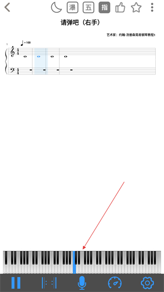 4、在弹奏界面可查看乐谱,同时通过底部虚拟钢琴进行弹奏练习,还可使用播放、调速等功能辅助学习。