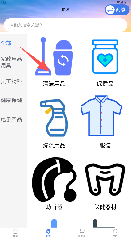 2、进入商城页面后在左侧分类栏选择“清洁用品”查看商品列表。